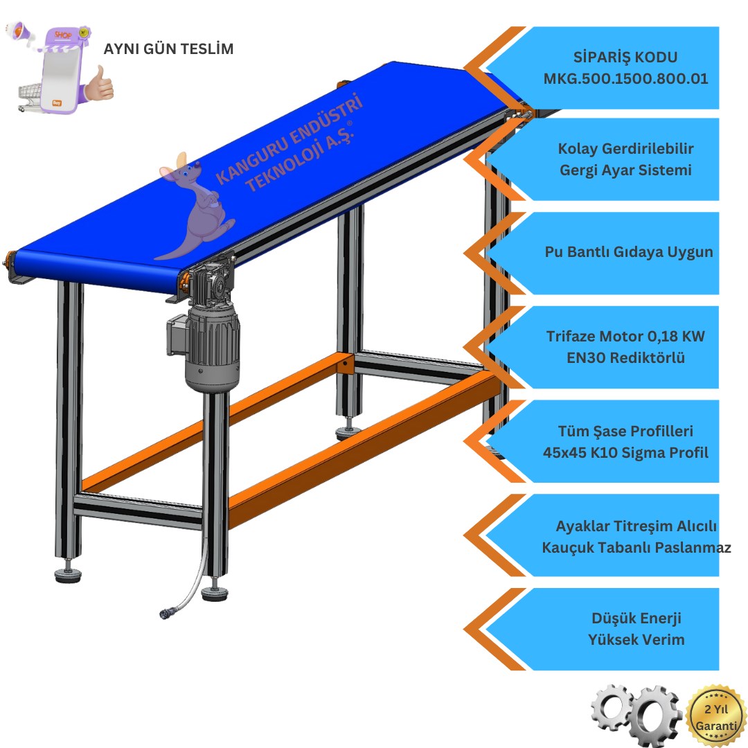 Gıda üretiminde hijyen, en önemli faktörlerden biridir. 500x1500x800 mm Gıdaya Uygun Mavi Renk Bantlı Konveyör, gıda güvenliği ve hijyen gereksinimlerini sağlamak amacıyla özel olarak tasarlanmıştır. FDA onaylı malzemeler kullanılarak üretilen bu konveyör, gıda ile temasta güvenli bir şekilde kullanılabilir. Mavi renkli bant, üretim hattındaki kirleri ve yabancı maddeleri kolayca fark etmenizi sağlar, böylece hijyen seviyesi her zaman yüksek olur.