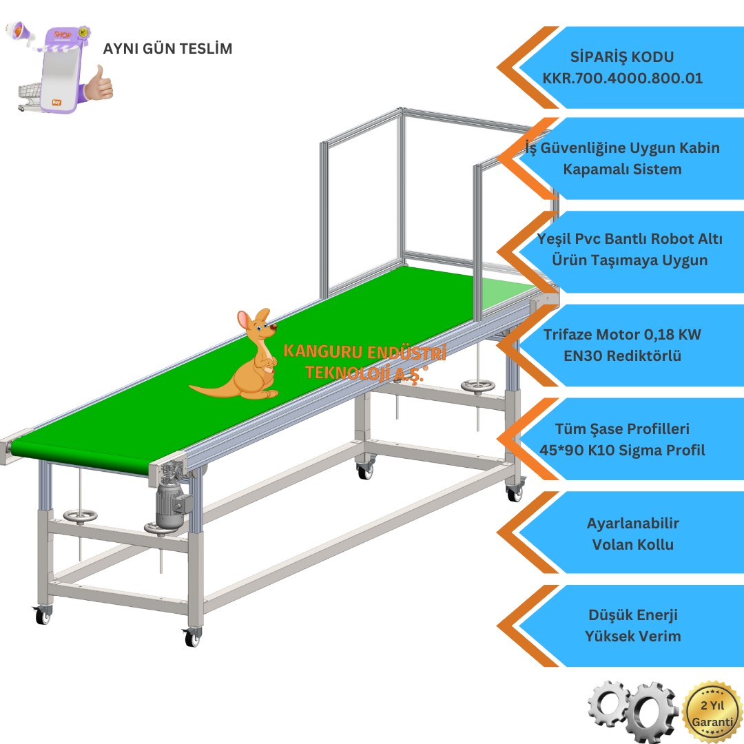 700 x 4000 x 800 mm ölçüleri ile uzun hatlı üretim alanları için ideal bir seçenektir. Alüminyum sigma profilli yapısı hafif ve taşınabilirdir, PVC bant ise yüksek dayanım ve uzun ömür sunar.
